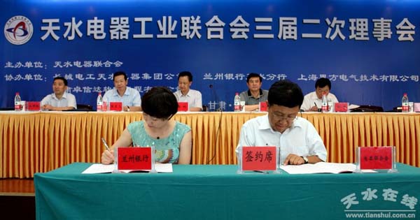 会上,市领导亲自为天水天辰电器有限公司等12户新入会的理事单位颁发了天水电器工业联合会理事证书。兰州银行天水分行行长助理董丽丽、天水电器工业联合会秘书长韦利民代表银企双方现场签署了金融服务合作意向书。会议还创新了办会模式,安排兰州银行天水分行、上海思方电气技术有限公司、甘肃卓信达软件工程有限公司、长城电工物流有限公司、天水力天软件开发有限责任公司及天水经济技术开发区招商局等六家单位就金融服务项目、企业信息化建设、智能电网、电气工程软件应用和天水社棠产业孵化园招商等内容进行了大会交流互动,收到了良好效果。