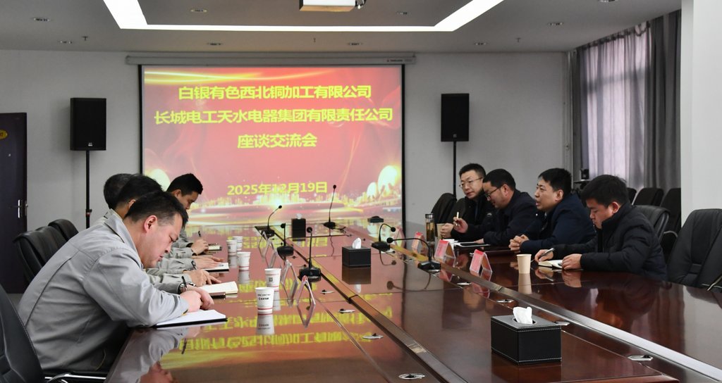 2025年12月19日,白银有色西北铜加工有限公司董事长王树龙一行4人到访天电集团,与集团党委书记、董事长张玉清、公司党支部书记、总经理韩林虎就加强合作开展座谈交流。